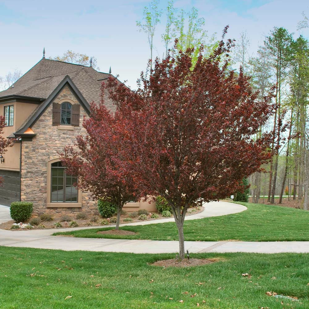 In the spring, Krauter Vesuvius leaves emerge with a unique shade of dark purple that they keep all season, then hundreds of soft pink blossoms erupt all over the canopy to create a stunning display of contrasting colors. In the fall, bright red plums about the size of cherries brighten up the landscape even more.