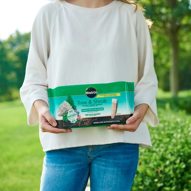Use MiracleGro® Tree & Shrub Plant Food Spikes once a season, in the Spring and Fall, for lush, beautiful foliage and vibrant color on all deciduous, evergreen, and flowering trees and shrubs.