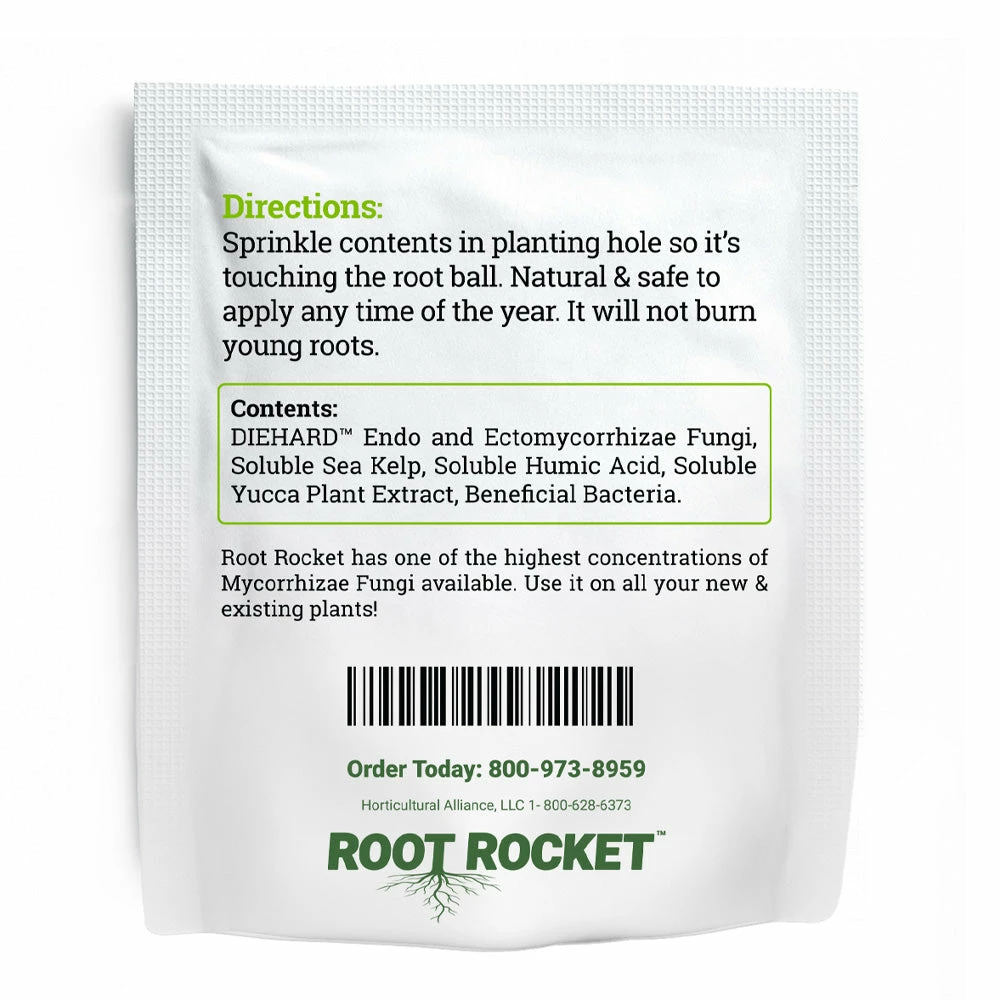 Root Rocket® is a special mix of nutrients that have been horticulturalist-tested for amazing results. Proven to help young plants in their transition from nursery containers into the ground or a more permanent container, the nutrients in each Root Rocket® includes endo and ectomycorrhizae fungi, soluble sea kelp, soluble yucca plant extract, beneficial bacteria and Horta-Sorbe Water Management Gel.