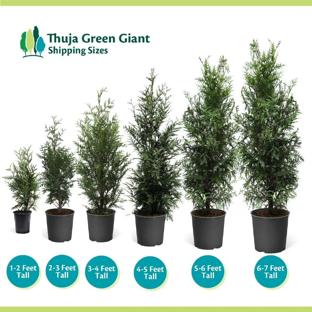 The Thuja Green Giant is the perfect fast-growing evergreen for a privacy hedge or windscreen. Plant one every 5 to 6 feet and they quickly create a dense barrier. You can easily trim them once a year to your desired height. Left unpruned, Thuja Green Giants planted in rows can reach as high as 30 to 50 feet. Your Thuja foliage stays soft and thick all year long.