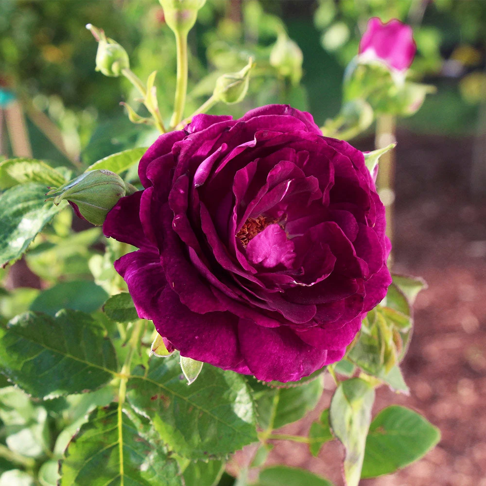 Plant your rose in a hole twice as wide but just as deep as the root ball. Water immediately to establish roots. Add a 3-inch layer of mulch to prevent weeds.